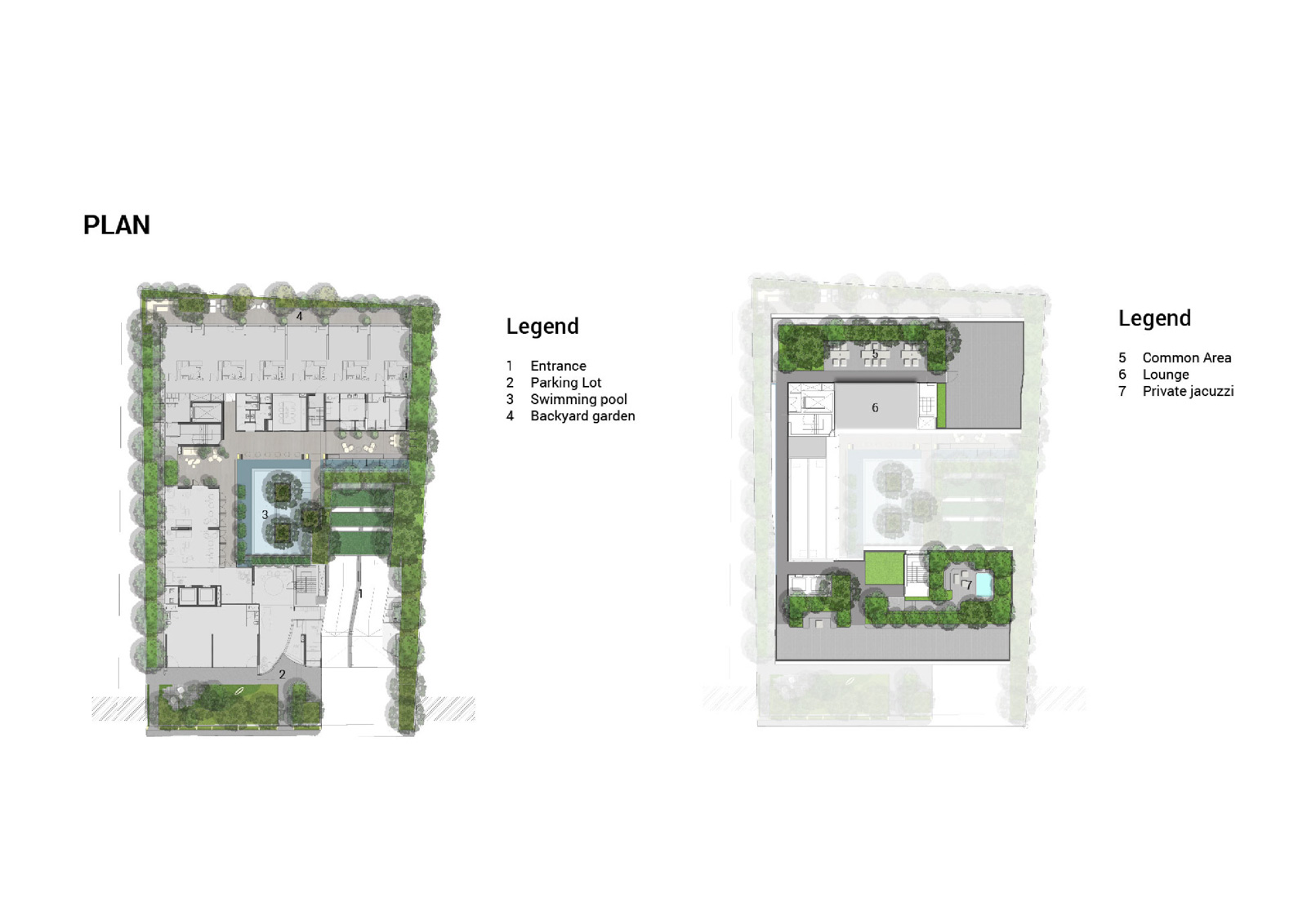 Additionally, there is a “Feature Planter Tree” that serves as a large and small tiered like cave structure. It helps elevate the height of trees and plants also acting as a focal point visible from within the private living spaces. The green stone wall edge of the swimming pool enhances the vibrant atmosphere within the central area. with large trees and hanging vines adorning the stone walls, creating a natural ambiance with the play of shadows and light. Whether you are inside your private room or relaxing in Cenotes Court, every element and sensory experience contributes to a sense of relaxation. It can soothe the minds of the residents, offering a respite from the hustle and bustle. Moreover, the landscape behind the project serves as a backyard garden where residents can meet and unwind in a serene atmosphere. It also provides privacy by using large trees as a screen around the perimeter walls, helping to reduce noise and block outside views.